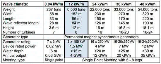 The Wave Dragon is a slack-moored floating WEC that operates on the overtopping principle. The Wave Dragon, developed by a Danish company of the same name (Copenhagen, Denmark), has been under continuous development for over 20 years. This device channels incoming waves toward a doubly curved ramp using two wing reflectors. The waves surge smoothly up the ramp without breaking and overtop into a reservoir that is positioned above the mean water level, as illustrated in Figure 1. The device’s power take-off (PTO) system comprises several variable-speed, low-head hydro turbines connected to Permanent Magnet Synchronous Generators (PMSGs). Electricity is generated as water from the reservoir flows back to the sea through these turbines. The turbines used are of the axial type, featuring fixed propeller blades and guide vanes. The rotational speed of the turbines is regulated according to the available pressure head by a back-to-back frequency converter system. The control system activates the turbines in a cascading sequence based on the reservoir’s water level. This PTO system has demonstrated high efficiency, maintaining over 25% across all operational conditions []. Details and specifications of the available Wave Dragon models are documented in Figure 2, based on information from []. In this paper, the 1.5 MW Wave Dragon model is used.