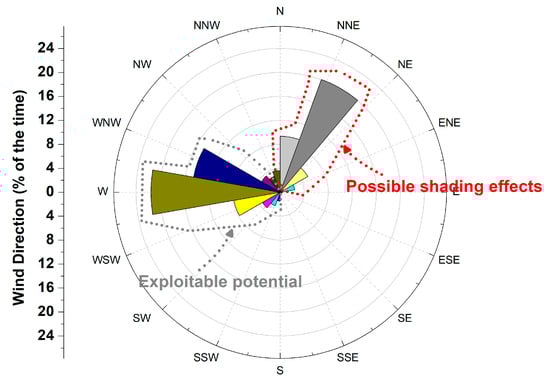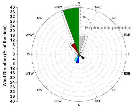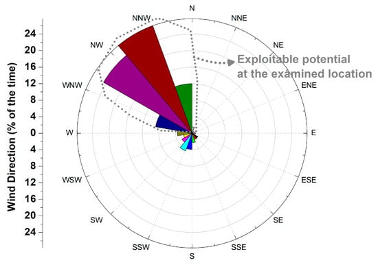 Eastern Crete is characterized by consistent northwest wave potential, an optimal condition for the Wave Dragon converters, which cannot be easily reoriented to accommodate varying wave directions. The wind rose diagram in Figure 4 confirms that the wave potential predominantly aligns northwest for approximately 80% of the year, making it suitable for fixed Wave Dragon converters.