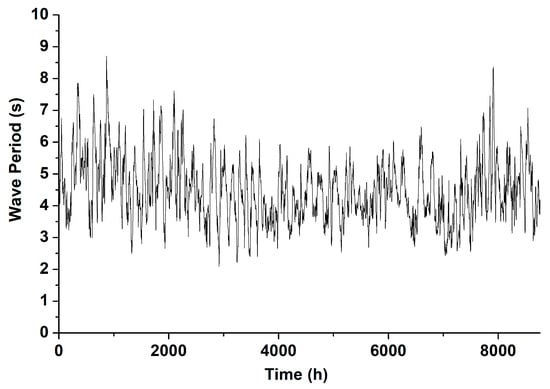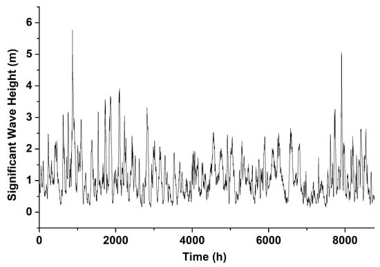 Wave data for the location between Crete and Kasos, specifically significant wave height, period, and direction, were sourced from the Copernicus Marine System [] and analyzed on an hourly basis over a full year. Figure 5 and Figure 6 illustrate the respective and data for this site for each hour t ∈ {1, …, 8760}.