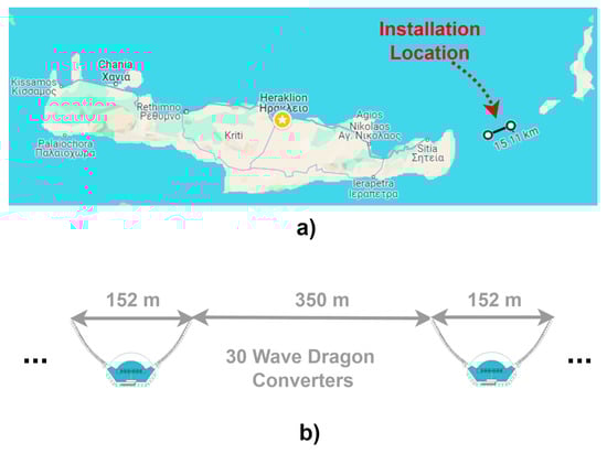 (a) Installation location of wave power facility on the eastern coast of Crete (image from Google Maps), and (b) layout and spacing details for Wave Dragon converters.