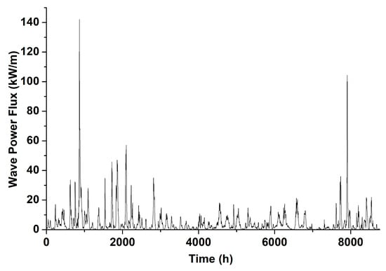 Utilizing Equation (2) along with the and data obtained by the Copernicus Marine System []—which underwent specific adaptations, as detailed in Appendix A—the wave power flux can be calculated, as shown in Figure 8, for each hour t ∈ {1, …, 8760}. The total annual wave energy flux per unit width is given in (3).