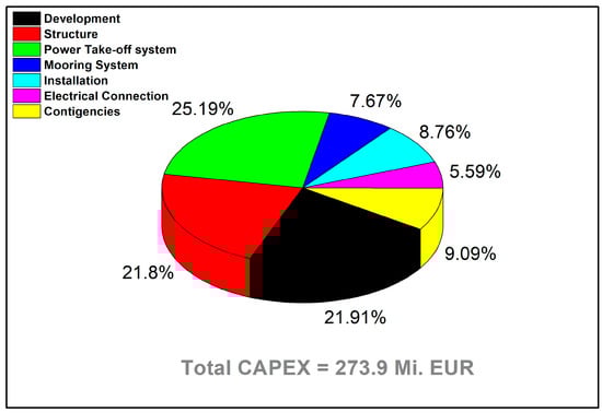 The cost breakdown of the investigated wave power facility is quoted in Table 1 and Figure 9. The initial installation cost, or capital expenditure (CAPEX), amounts to EUR 273.9 million (Mi. EUR). This figure is derived from the CAPEX estimates found in [], aligning with the cost projections in [,,]. However, due to anticipated commercialization advances, CAPEX is expected to significantly decrease to below 2 Mi. EUR per MW by 2050, as illustrated in Figure 10 []. Operational expenditure (OPEX) encompasses all costs related to the operation of a wave power farm from the issuance of a takeover certificate. This includes expenses for operation and maintenance (O&M) activities, site leasing, and insurance. OPEX is projected to decline from 5.8% to 2.4% by 2050, particularly for facilities situated near the coast, as depicted in Figure 10 []. Moreover, the operational lifetime of WECs is expected to extend from 20 to 30 years, especially in milder marine environments like the Aegean Sea, which are less prone to extreme events [].