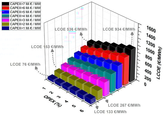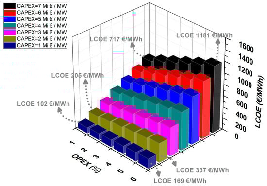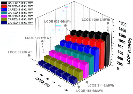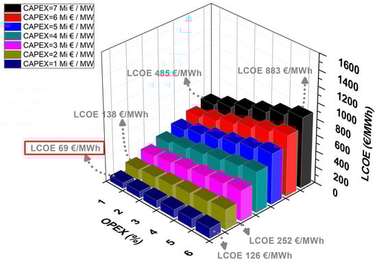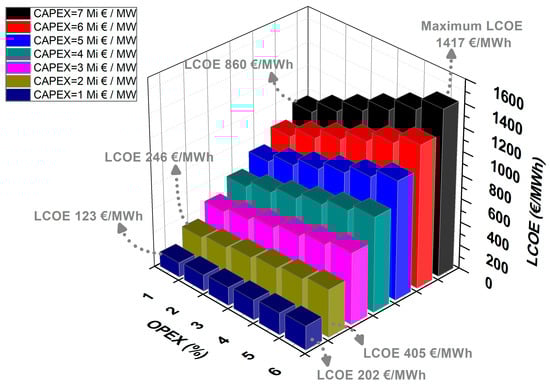 The LCOE for Scenario 1 is illustrated in a three-axis graph in Figure 11. The CAPEX values are plotted on the x-axis, ranging from EUR 1 million to EUR 7 million. This range covers all expected CAPEX costs and projected reductions through to the year 2050, as illustrated in Figure 10. The y-axis displays the annual OPEX as a percentage of CAPEX, varying from 1% to 6%. The z-axis shows the LCOE in EUR/MWh. With the current CAPEX of EUR 7 million and OPEX at 6%, the LCOE peaks at 1417 EUR/MWh; this is significantly higher than the current LCOE in Crete, which ranges from 237 to 300 EUR/MWh []. This figure is also uncompetitive when compared to the LCOE of offshore wind power, currently estimated between 72 EUR/MWh and 140 EUR/MWh []. Nevertheless, with the anticipated reduction in CAPEX and OPEX for wave power, the LCOE could potentially decrease to as low as 123 EUR/MWh, assuming CAPEX and OPEX are reduced to EUR 1 million and 1%, respectively.