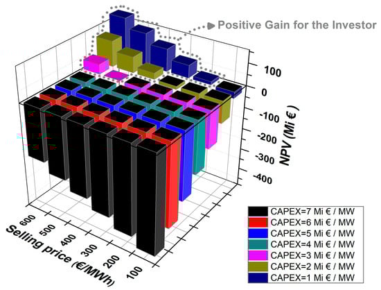 NPV value of the investment for different CAPEX and electricity selling prices, assuming lifetime = 20 years, = 25%, and OPEX = 3%.