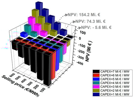 NPV value of the investment for different CAPEX and electricity selling prices, assuming lifetime = 30 years, = 35%, and OPEX = 3%.