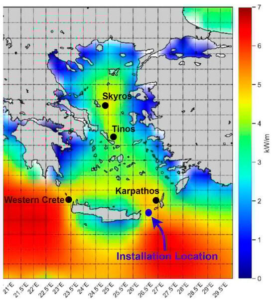 Figure 3 illustrates the fifteen-year mean wave power of the Aegean Sea, highlighting the area between the islands of Crete and Kasos as the selected location for this study due to its robust wave potential, as evidenced by the data in []. This region also boasts strong wind potential, making it suitable for hybrid offshore wave and wind energy facilities. A key advantage of this site is its proximity to Crete, which is expected to be linked to the Greek mainland via an HVDC submarine cable by 2025 and to Cyprus and Israel by 2030 [,]. This strategic positioning enables the efficient transmission of blue energy to major load centers through multiple submarine interconnections.