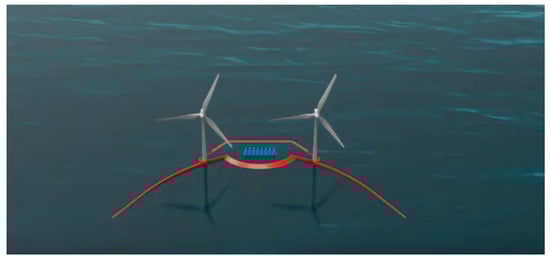 This paper focuses exclusively on wave power, without exploring the potential synergies with other offshore renewable energy sources, such as wind and floating photovoltaics. Integrating various types of offshore renewables could yield significant benefits. For instance, Figure 21 illustrates a Wave Dragon unit equipped with offshore wind turbines. Co-developing wave and wind energy systems could lower CAPEX and OPEX, enhance spatial energy density, reduce energy variability, and ultimately decrease the levelized cost of offshore energy. This subject warrants further exploration. Additionally, hybrid offshore renewable energy systems could be employed to refuel electric or hydrogen-powered ships navigating the Mediterranean Sea. This approach could foster a blue renewable and hydrogen economy within the Mediterranean, aimed at supporting the decarbonization of the maritime sector. This is another topic that merits future consideration.