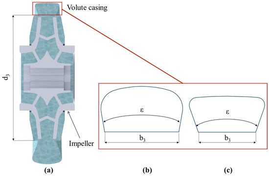 (a) Placement of the investigated geometric parameters of the volute casings; example view (b) circular and (c) trapezoidal shape of the cross-section of the volute casings.