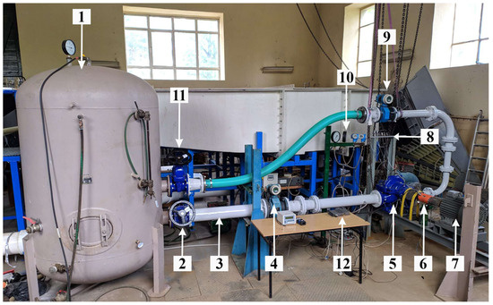 The double-entry pump experimental stand: 1—tank; 2, 11—valve; 3—inlet pipe; 4, 9—electromagnetic flowmeter; 5—double-entry pump; 6—couplings, torque meter and photo/contact tachometer; 7—electrical engine; 8—pressure sensors; 10—manometers and electronic pressure transmitters with display; 12—specially created recording module.
