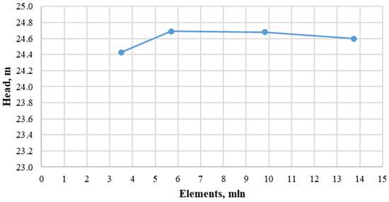 The computational model (Figure 3b) consists of an inlet and outlet pipeline, a volute casing, an impeller, an inlet casing and the sidewall gaps (semi-transparent colour). The total number of elements was assumed to be approximately 10 million according to the mesh independence test (Figure 4). The influence of the mesh quality on the calculation time and quantity of the mesh elements on the Y+ value was also taken into account when choosing the final mesh to conduct numerical research.