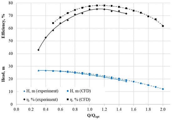 Comparative characteristics of experiment and numerical simulation (CFD) results: head and efficiency curves.