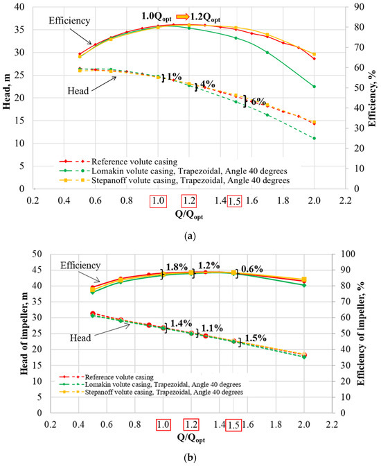 Head and efficiency with the volute casing: reference, Stepanoff and Lomakin of (a) pump; (b) impeller.