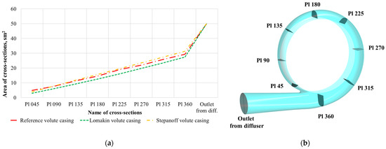 (a) Cross-sectional area changes in volute casings; (b) Cross-sections of the volute casing used for flow analysis.