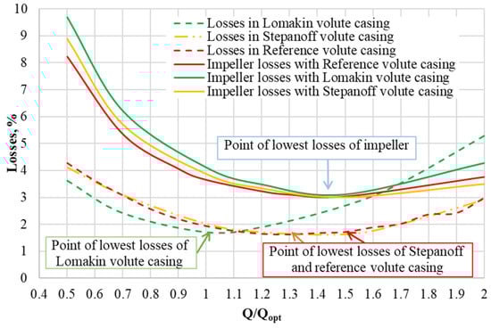 Comparative characteristics of losses in impeller and Stepanoff, Lomakin and reference volute casings.