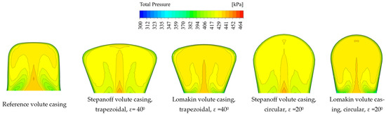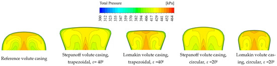 Differences in the flow structure are caused by the different widths of the volute casing inlet (sidewall gaps), the wall opening angle and the cross-sectional area of the volute casing. Perpendicular walls for the volute casing exhibit the greatest difference in the structure of the flow, as seen in the case of the reference volute casing. The Lomakin volute casing has a larger higher total pressure area at the centre of the cross-section, which is caused by the smaller cross-sectional area and correspondingly higher velocities.