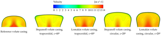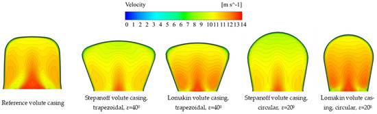 The absolute velocity distribution in the impeller is similar and uniform for pumps with all volute casings. The velocity typically decreases from the inlet of the volute casing to the upper part (Figure 14). There are differences in the same place as in Figure 13 caused by different heights and of course different areas of cross-sections in the volute casing. The growth rate of the area from intersection Pl 45 to Pl 360 depends on the design method.