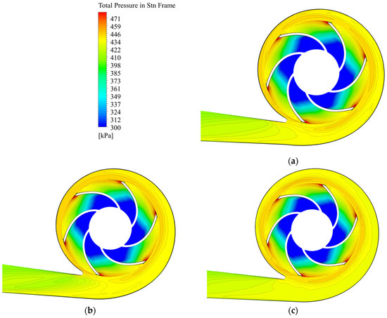 Comparison of total pressure distributions in middle longitudinal cross-sections with flow rate 1.0Qopt for (a) reference volute casing; (b) Lomakin volute casing (trapezoidal, ε = 40°); (c) Stepanoff volute casing (circular, ε = 20°).
