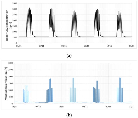 Since the model accurately reflects real conditions, it was used for the further simulation of CO2 concentration throughout the heating season in Cracow (1 November thru 31 March). Figure 10 and Figure 11c,d show the variations in CO2 concentration over the entire five-month period as well as shorter intervals, including five working days and one particular day. When comparing these diagrams with Figure 2, presenting measurement data, a similar trend in changes can be observed across all weeks. Figure 11b,d present the changes in ventilation airflow for five working days and one particular day. The average, maximum and minimum values for both CO2 concentration level and air flow are listed in Table 4.