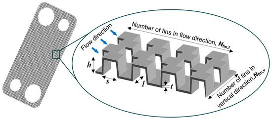 Figure 1 presents a schematic of the offset-fin heat exchanger utilized in this study. Similar to traditional plate heat exchangers, offset heat exchangers comprise several fin layers, as shown in Figure 1, with the refrigerant and coolant flows circulating through each layer in succession. The analysis was confined to the central rectangular area of a single layer. Hence, comparisons drawn between various cases are intended to highlight relative differences in thermal and hydraulic performance.
