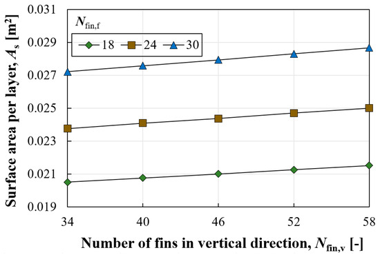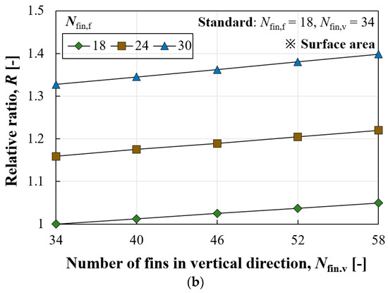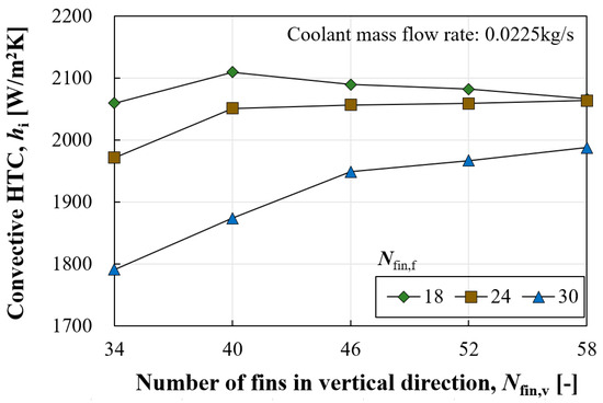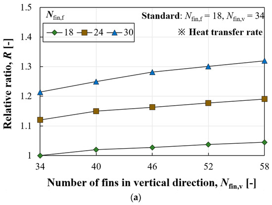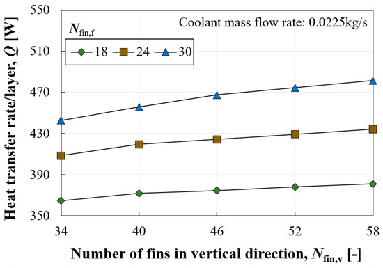 The heat transfer rate tends to increase with more fins in both directions. However, the increase in the heat transfer rate according to Nfin,v was significantly different depending on Nfin,f. The difference in heat transfer rate between Nfin,v values of 34 and 58 was about 4.48% when Nfin,f was 18, while it was 8.74% for Nfin,f of 30. The increase in the heat transfer rate can be attributed to two factors: an increase in surface area and an enhanced convective heat transfer coefficient. In the case of Nfin,f of 18, the increase in surface area between Nfin,v values of 34 and 58 was 4.94%, which is only a 0.45% difference compared to the increase in heat transfer rate, indicating that the heat transfer rate was primarily enhanced due to the enlarged surface area. On the other hand, in the case of Nfin,f of 30, the increase in surface area between Nfin,v values of 34 and 58 was 5.34%, suggesting that the remaining increase was due to the enhanced convective heat transfer coefficient.