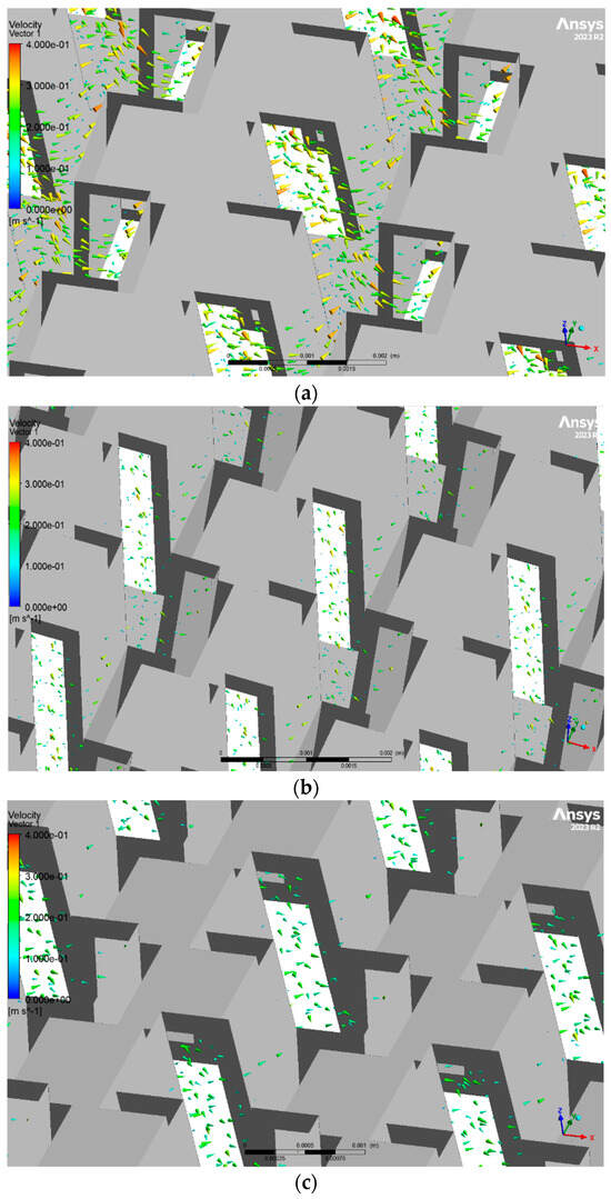 Velocity vectors of coolant flow for several cases: (a) Nfin,f = 18, Nfin,v = 40; (b) Nfin,f = 30, Nfin,v = 40; (c) Nfin,f = 30, Nfin,v = 58.