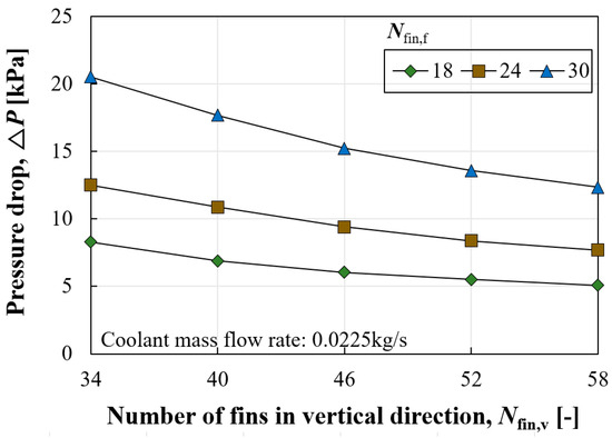 Figure 3 presents a comparison of heat transfer rates at the standard coolant flow rate. Increasing the number of fins in the flow direction significantly enhances the heat transfer rate. In contrast, increasing the number of fins in the vertical direction has a relatively minor impact on thermal performance. The heat transfer rate is influenced by both the heat transfer area and the convective heat transfer coefficient. Figure 4 shows the relative ratio of the heat transfer rate and surface area. The term “relative ratio” refers to the comparative degree of heat transfer rate or surface area relative to the standard configuration, where Nfin,f and Nfin,v are 18 and 34, respectively. The diminishing relative difference in heat transfer rates for configurations with Nfin,f values of 18, 24, and 30, compared to their surface areas, indicates a decrease in the convective heat transfer coefficient with an increasing number of fins in the flow direction. However, variations in the number of fins in the vertical direction do not significantly affect the convective heat transfer coefficient.
