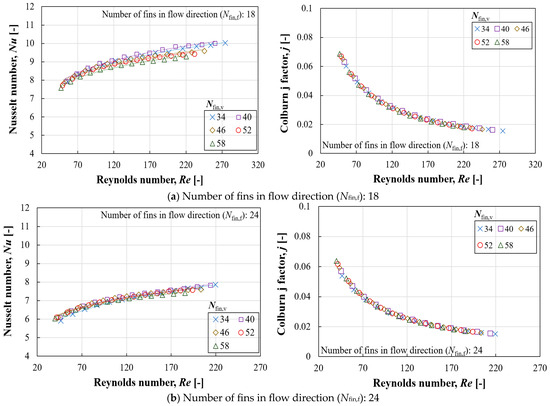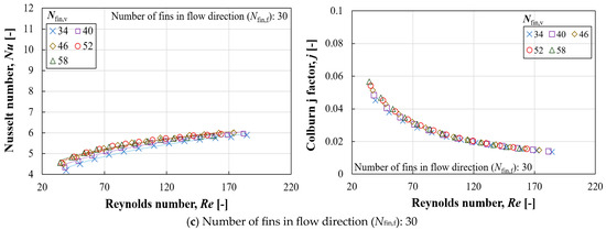 Nusselt number and Colburn j factor according to Reynolds number: (a) Nfin,f 18, (b) Nfin,f 24, and (c) Nfin,f 30.