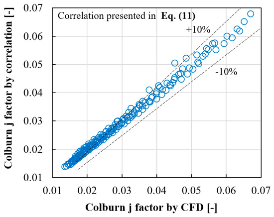 Comparison of j factor obtained through CFD and correlation of Equation (11).