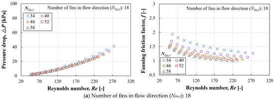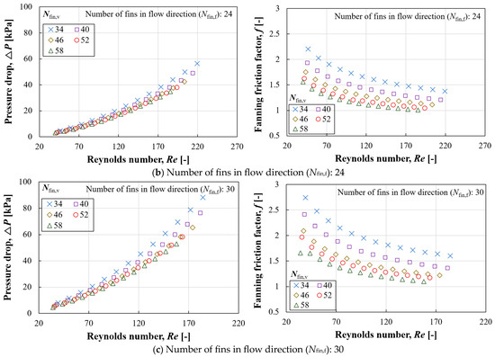 Pressure drop and Fanning friction factor according to Reynolds number: (a) Nfin,f 18, (b) Nfin,f 24, and (c) Nfin,f 30.