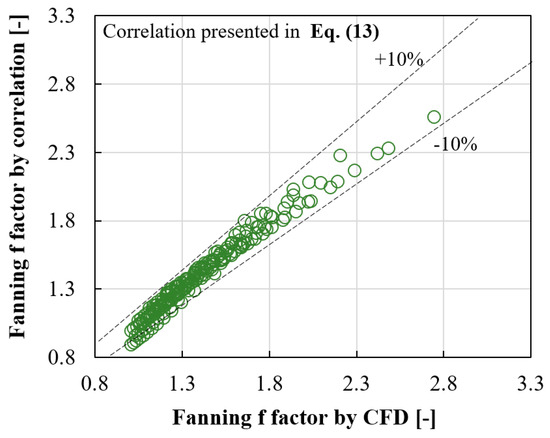 Table 6 presents the values of the fitted constants, and Figure 11 compares the f factor obtained from CFD analysis with the calculated values from the correlation. This comparison also demonstrates reasonable agreement, with errors within ±10%.