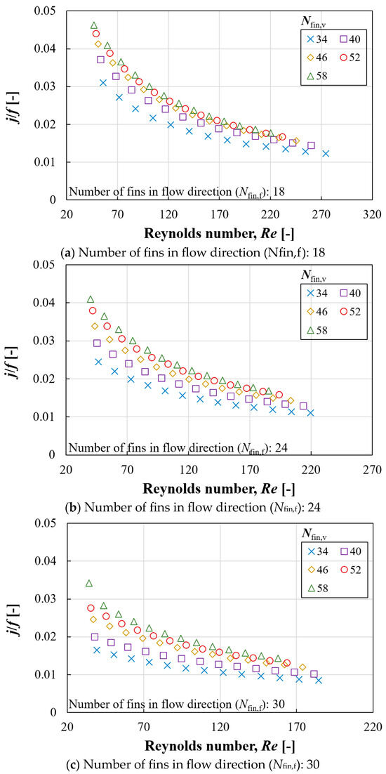 The concept of the flow area goodness factor, represented by the ratio of the Colburn j factor to the Fanning f factor versus the Reynolds number, serves as a common approach to jointly assess thermal and hydraulic performance. Figure 12 illustrates this ratio according to the Reynolds number. A higher flow area goodness factor indicates that a smaller frontal area for the heat exchanger is required [43], which also implies that the heat transfer rate per unit of frontal area is large [44]. As a result, the area goodness factor was found to be larger for higher Nfin,v and lower Nfin,f values, signifying an improvement in pressure loss and the f factor. In contrast, the Colburn j factor was less influenced by the geometric characteristics of the fins.