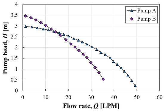 The thermal performance of heat exchangers is significantly influenced by the coolant flow rate, which is determined by the performance curve of the pump and the resistance curve of the heat exchanger. To assess the impact of pump characteristics on thermal performance, two hypothetical pumps with different performance curve shapes are considered. As illustrated in Figure 13, Pump A is capable of circulating a higher flow rate at the same pump head than Pump B, which exhibits steeper performance curves. The difference in flow rates between the two pumps at a given head is particularly notable in the flow rate range exceeding 20 L per minute (LPM). The flow rates discussed here pertain to the total coolant flow rate rather than the flow rate through a single layer. That is, it is assumed that an identical flow rate uniformly circulates through 15 layers by reflecting heat generation amount of electric vehicle batteries. Wang et al. [46] revealed that average rate of heat generation of a lithium ion battery module ranges from 12,416.25 to 104,790 W/m3. Additionally, Berjoza and Jurgena [47] reported that the weight of batteries for EVs ranges from 385 to 544 kg, and the equivalent density of 18,650 battery cells is about 2018 kg/m3 [48]. Considering those values from related research, the number of layers is assumed to be 15, whose heat transfer rate becomes around 7 kW.