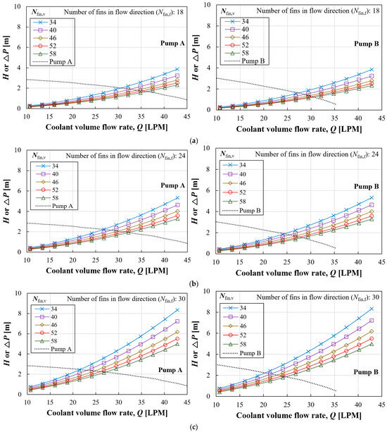 Coolant volume flow rate corresponding to the resistance and performance curves. (a) Number of fins in flow direction (Nfin,f): 18. (b) Number of fins in flow direction (Nfin,f): 24. (c) Number of fins in flow direction (Nfin,f): 30.