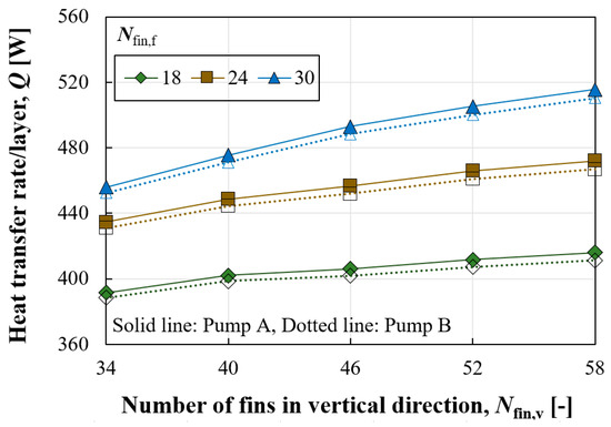 Figure 15 presents a comparison of the heat transfer rate at the actual coolant flow rate, aiming to identify differences from the constant coolant flow rate scenario depicted in Figure 3. No reversals in results between geometric cases are identified; the configurations with the largest Nfin,v and Nfin,f exhibit the highest heat transfer rates. However, the disparity between cases, when considering a consistent coolant flow rate and the actual flow rate, is notably distinct. Specifically, results tend to show a more pronounced increase with an increase in Nfin,v. This is attributable to the decrease in pressure loss with higher Nfin,v, allowing a greater coolant flow rate and, thus, enhanced heat transfer. Moreover, as the installation of more fins in the flow direction reduces the coolant flow rate, the performance gap attributable to Nfin,v narrows when the actual coolant flow rate is taken into account. Interestingly, the type of pump utilized does not significantly impact the heat transfer rate. The maximum difference in heat transfer rate between cases using Pump A and Pump B was only 1.15%, indicating that distinct pump performance curves do not markedly affect outcomes.