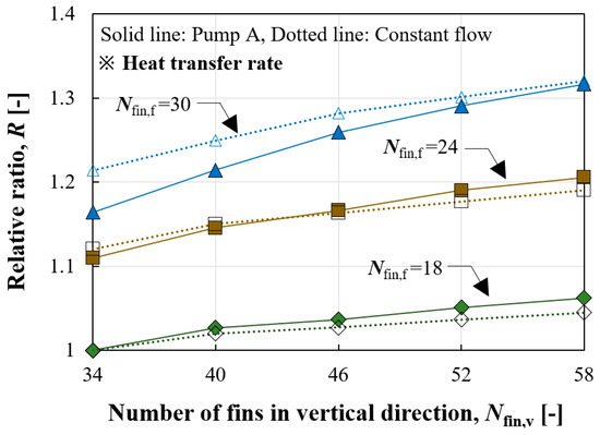 On the other hand, the difference in heat transfer rate between the cases of constant coolant flow rate and actual flow rate is quite distinguishable. Figure 16 depicts the comparison of relative ratio at each case. The term “relative ratio” refers to the comparative degree of heat transfer rate relative to the standard configuration, where Nfin,f and Nfin,v are 18 and 34, respectively. The impact of the pump’s performance curve on the heat transfer rate becomes more pronounced with increased pressure drop. For instance, when Nfin,f is 30, the ratio of the maximum to the minimum heat transfer rate was 8.73% with a constant coolant flow rate, but this ratio increased to 13.08% when considering the actual coolant flow rate facilitated by a pump. Considering both the performance and resistance curves facilitates a more precise comparison between geometric configurations.