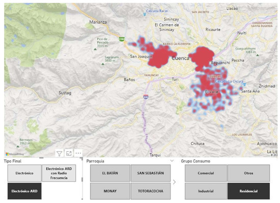 In general, the residential consumption group is the one that represents the highest percentage of users, with 90% of the installed meters. The urban regions of Monay and El Batán use electronic ARD registers with radio frequency, despite representing a minority of users. However, the rural region of Valle significantly exceeds these regions in meter usage, as shown in