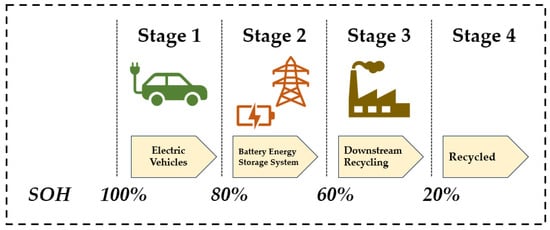 Lithium-ion batteries used in electric vehicles (EVs) have a finite lifetime, and for safety reasons must be replaced when their capacity drops to 80% or below []. However, these batteries can still be repurposed for other applications, where the remaining capacity is sufficient for less demanding tasks. Figure 1 illustrates the life cycle of lithium-ion batteries, where a battery energy storage system (BESS) can effectively utilize retired batteries when their state of health (SOH) is between 80% and 60% [,]. The BESS comprises one or more battery packs, each of which uses a group of battery cells connected in parallel and in series [], to store electrical energy as backup power for households, data centers, charging stations, etc. []. Battery cells in a battery pack can be connected in one of two architectures shown in Figure 2: (a) a module groups the batteries in series, and then the modules are connected in parallel (denoted S-P), which is useful for high voltage applications; and (b) a module groups batteries in parallel, and then the modules are connected in series (denoted P-S) for applications requiring high capacity. In the past few years, many projects around the world have implemented a BESS by repurposing EV batteries. In the Netherlands, a 2.8 MWh BESS was installed for Johan Cruijff Arena in 2018 by reusing Nissan LEAF battery packs, each consisting of 192 cells, in an S-P connection []. In Finland, a 2.6 MWh BESS was built in 2021 as a backup power resource for the power grid by repurposing Tesla Model S battery packs, each consisting of 7104 cells, in a P-S connection []. Table 1 summarizes recent projects that repurposed EV batteries for a BESS. By leveraging a BESS, the demand for new batteries can be significantly reduced, thereby lessening the environmental impact associated with battery production. However, a BESS that reuses retired lithium-ion batteries from EVs still has some limitations when implemented.