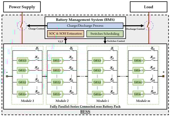 The BMS schedules the switches in the battery pack and external systems (i.e., the power supply or load demand) according to SOC and SOH estimation, as shown in Figure 3. To estimate SOC and SOH, the BMS monitors the voltage, current, and temperature of each battery cell. We define the SOC of cell at time t as the level of charge at time t relative to the maximum battery capacity by []