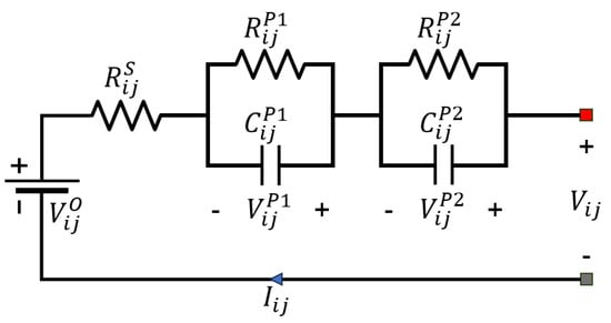 where is the measured current of cell at time slot t; and , respectively, are the polarization voltages of RC pairs (,) and (,) in cell at time slot t, and are calculated by using the EIS parameters at the previous time slot as []