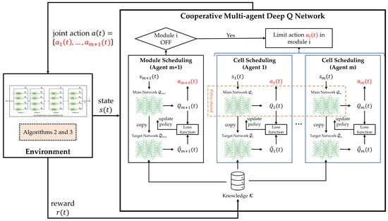 In the case in which state is not in , scheduling action is performed at random. We determine which modules are bypassed at time slot t, and then limit scheduling action in each agent of cell switch scheduling (agent 1 to m). If module i is bypassed, we limit action by turning OFF all cells in module i. Otherwise, the algorithm continues to assess the acquired knowledge to determine whether state is included in . If state is in , the algorithm selects action according to an -greedy policy as specified in Equation (38). In the case in which state is not in , scheduling action is chosen randomly. After all actions are chosen, a joint action is executed.