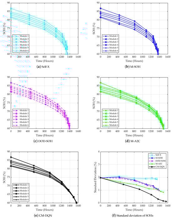 We evaluated the performance of the proposed algorithm on balancing the SOH of modules, as shown in Figure 6. The SOH balancing of modules in the battery pack in all the algorithms is shown in Figure 6a–e. The proposed algorithm (CM-DQN) achieved more SOH balancing than previous work. During learning, the CM-DQN framework determines the optimal actions known as switches to connect or bypass cells and modules by observing BESS states such as the SOCs and SOHs of cells and modules, power demand , or available power supply . CM-DQN ensures that no single module degrades significantly faster than the others by fully observing the states in the BESS (including SOC, SOH of modules and cells, charging and discharging states, and the power demand). Figure 6f compares the standard deviation in SOHs among the modules over time for each algorithm. CM-DQN exhibited the lowest standard deviation (close to zero), compared to previous work, further affirming its ability to maintain SOH balance among modules. Self-X showed an SOH imbalance that was almost unchanged without considering SOHs. Other methods (M-SOH, DOD-SOH, and M-A2C), which considered SOHs, reduced the SOH imbalance but, without observations of the states in the BESS, the standard deviation was still higher than CM-DQN, indicating that SOHs between modules were not balanced until the end of the lifetime. With heterogeneous SOHs in the battery pack, CM-DQN offered better performance than other algorithms by balancing SOHs among the modules.