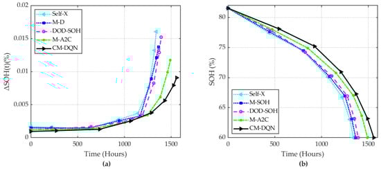The performance of the proposed algorithm on battery pack lifetime, measured by minimizing SOH reduction, was evaluated and is shown in Figure 7. By balancing the SOHs among the modules in the battery pack, the proposed algorithm (CM-DQN) achieved the lowest SOH reduction in the battery pack compared to the other algorithms by minimizing the SOH reduction for each time slot, as shown in Figure 7a. The reduction in SOH under Self-X and M-SOH increased rapidly after 1200 h, compared to the other algorithms, due to the lack of consideration of both SOC and SOH. M-A2C had the closest performance to CM-DQN, but ignoring external systems information caused the SOH reduction, , to increase faster as the battery lifetime weakened after 1250 h. The SOH reduction in the battery pack was minimized with CM-DQN, resulting in an extended battery pack lifetime, as shown in Figure 7b. The proposed algorithm CM-DQN achieved a longer battery pack lifetime compared to previous work. The SOH of the battery pack under CM-DQN reached 60% (the end of its second life) after a working time of 1558 h. By not observing the states in the BESS, all other work finished the second lifetimes significantly faster than CM-DQN. Table 5 shows that the battery pack lifetime improvement of the proposed algorithm (CM-DQN) compared to previous work was up to 16.27%. Hence, the proposed algorithm can efficiently schedule switches in the battery pack to maximize the BESS lifetime and balance the SOHs among the modules and cells.