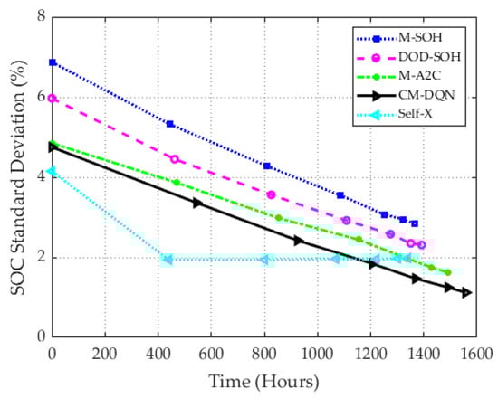 To show the impact of SOC balancing on the lifetime of the battery pack, the standard deviations of the SOCs in a battery pack under different algorithms are shown in Figure 8. Self-X, which only focused on SOCs, had better SOC balancing than other algorithms but stopped decreasing after some time and had a worse battery pack lifetime, as shown in Figure 7b. CM-DQN had a continuously decreasing standard deviation over time and it was lower than that of Self-X after 1130 h. Although the proposed algorithm (CM-DQN) focused on only balancing the SOHs of cells by observing SOCs, it also decreased the SOC imbalance among the cells in a battery pack and achieved a longer lifetime. As a result, scheduling cells and modules in a battery pack for SOH balancing is more important to extend the lifetime of the battery pack, as shown in Figure 6f, Figure 7 and Figure 8.