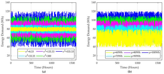 We studied the performance of the proposed algorithm in scenarios with different power demands, as shown in Table 6. We considered various conditions in Scenario 1 with the same mean (80 Wh) and incremental variance (from 8.33 to 533.33), as shown in Figure 9a, and in Scenario 2 with the same variance (133.33) and incremental mean (from 60 Wh to 100 Wh), as shown in Figure 9b. Understanding the impact of demand variance is essential for evaluating the robustness and adaptability of battery management algorithms in real-world applications.