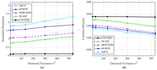 Figure 10 illustrates the impact of different load demand conditions, characterized by varying demand variance (), on the lifetime of algorithms under the same mean demand. In Figure 10a, it is observed that, as the demand variance increased from 8.33 to 533.33, the standard deviation for all algorithms also increased. The proposed algorithm minimizes the SOH reduction in the battery pack at each time slot by balancing the SOHs of the battery modules. The charge and discharge control algorithm (Algorithm 3) and observation of dynamic demands (shown in state vectors in (36)) helped CM-DQN consistently achieve the lowest standard deviation, indicating robustness against fluctuations in demand. In contrast, the previous algorithms showed an increasing standard deviation proportional to the variation in power demand, indicating a lack of adaptation to demand dynamics. Figure 10b examines the lifetime obtained by the algorithms. The proposed algorithm (CM-DQN) demonstrated a significantly longer lifetime than the others, maintaining a robust performance in SOH balancing and extending lifetime even as demand variance increased. This suggests the proposed algorithm is more adaptive and effective in extending a battery’s operational lifetime under varying demand conditions. In summary, the proposed CM-DQN algorithm outperformed the others in robustness (lower standard deviation and longer lifetime) when subjected to increasing demand variance.
