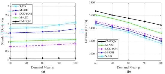 Figure 11 presents the performance of the algorithms under different mean demand conditions () while keeping the variance constant. Figure 11a shows the standard deviation of the algorithms’ performance as the demand mean increased from 60 Wh to 100 Wh. The CM-DQN algorithm consistently achieved the lowest standard deviation, indicating its robustness against variations in the demand mean. Figure 11b illustrates the lifetimes of the algorithms as the demand mean increased. The proposed CM-DQN algorithm exhibited the longest lifetime across all mean demand levels, demonstrating its efficiency in extending the battery lifetime under varying power demands. Overall, CM-DQN minimized the SOH reduction in the battery pack in handling different demand mean conditions, providing an extended battery lifetime and an SOH balancing among the modules.