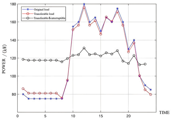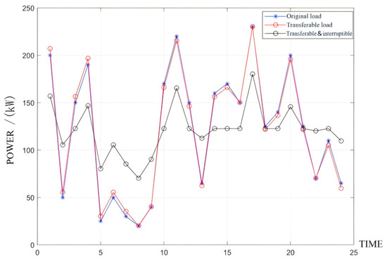 Figure 6 shows the curve after load optimization and adjustment. As can be seen from the figure, compared with the original load, the load curve, after taking interruptible load and transferable load into account, is more stable, which is conducive to system stability while promoting the consumption of new energy.