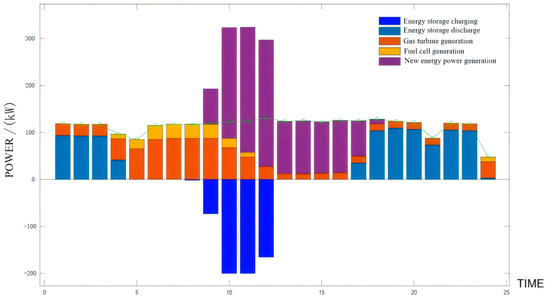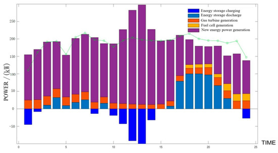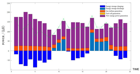Figure 7 shows the energy transaction diagram of microgrid I. It can be seen that the microgrid preferentially consumes new energy power generation, and the power storage is charged when the PV generation is excess at 9:00–12:00. Due to the finite energy storage capacity, the storage system tends to reach its full capacity by 12:00. During 12:00–13:00, the energy storage is no longer charged or discharged, and the electricity for users is supplied by new energy generation and gas turbine. Resulting in the discarding and wastage of excess PV generation during the period from 13:00 to 15:00.
