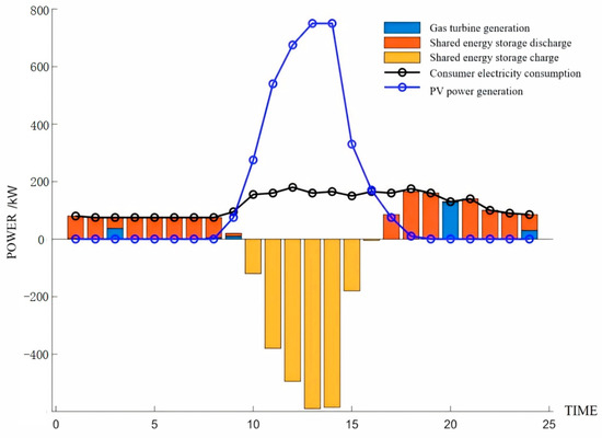 In Figure 14, the two curves represent user demand and photovoltaic power generation, and the bar graph represents gas turbine power generation, energy storage discharge, and energy storage charge. The superposition of each main output is user demand. As can be seen from the figure, when the photovoltaic power generation from 1:00 to 8:00, 17:00 to 19:00, and 21:00 to 24:00 does not meet the needs of users, energy storage and discharge are shared to supply users. When there is a surplus of photovoltaic power generation from 10:00 to 15:00, the remaining power is stored by a shared energy storage power station in order to reduce the light abandonment rate and improve the level of new energy consumption. At 13:00, the photovoltaic output reaches a maximum of 753.2 kW, and the shared energy storage also reaches a maximum charging power of 590 kW. When the rest of the shared energy storage is insufficient, the gas turbine power generation supplies the load. It can be seen that more photovoltaic surplus power is stored, and the gas turbine output is significantly reduced, which greatly improves the level of new energy consumption.