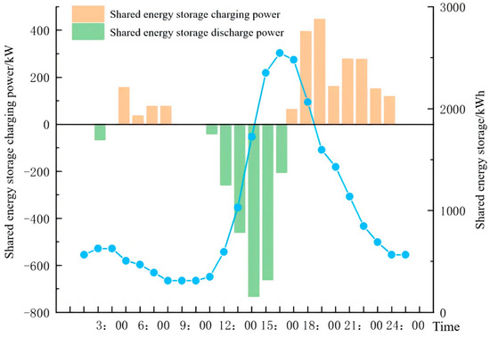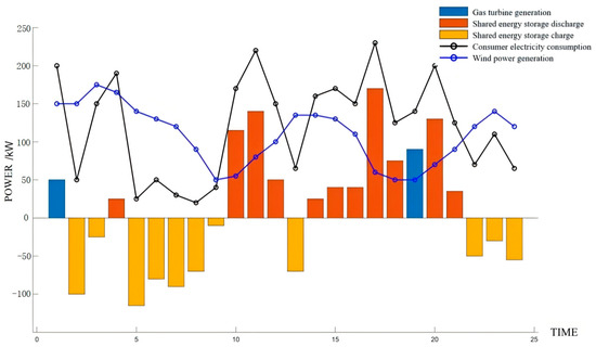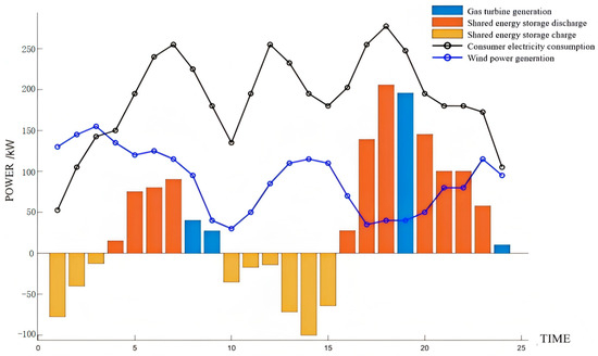 As can be seen from Figure 16, when there is a surplus of new energy generation at 1:00–3:00 and 10:00–15:00, the shared energy storage starts to charge and stores the excess electricity. When the new energy generation is insufficient from 4:00 to 7:00, 16:00 to 18:00, and 20:00 to 23:00, the shared energy storage discharge supplies energy to the user. The maximum shared energy storage charging power at 14:00 is 98.76 kW. At 8:00–9:00 and 24:00, shared energy storage is not enough to support the user and the gas turbine power generation. It can be seen that shared energy storage improves the utilization rate of new energy generation, and the use frequency of gas turbines is also greatly reduced.